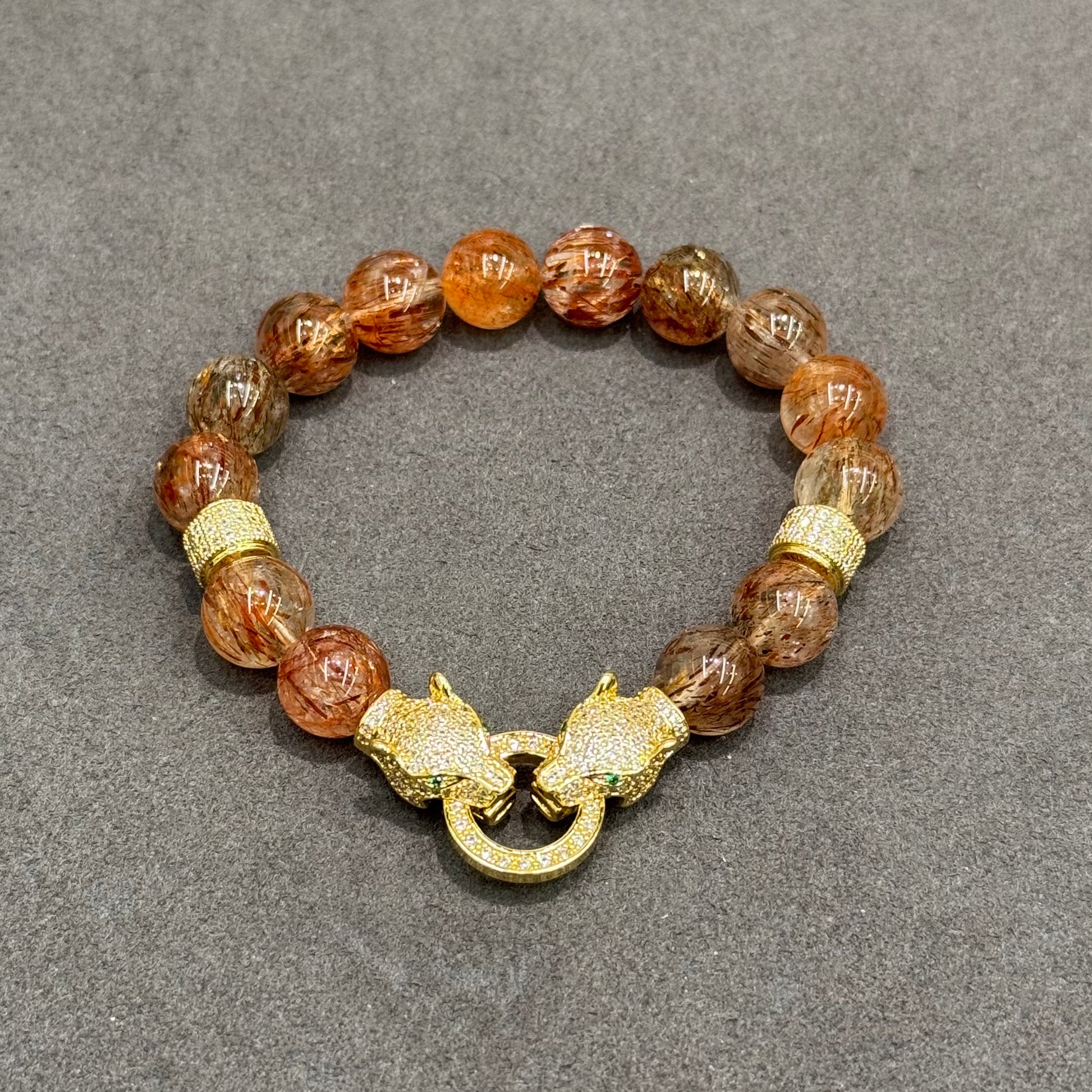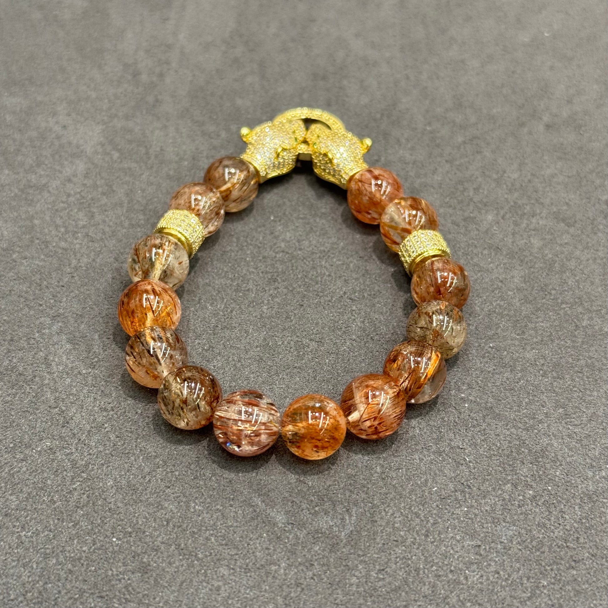 Bracelet Material: Black Gold Super 7 Quartz, Full CZ Pavé Leopard Head
