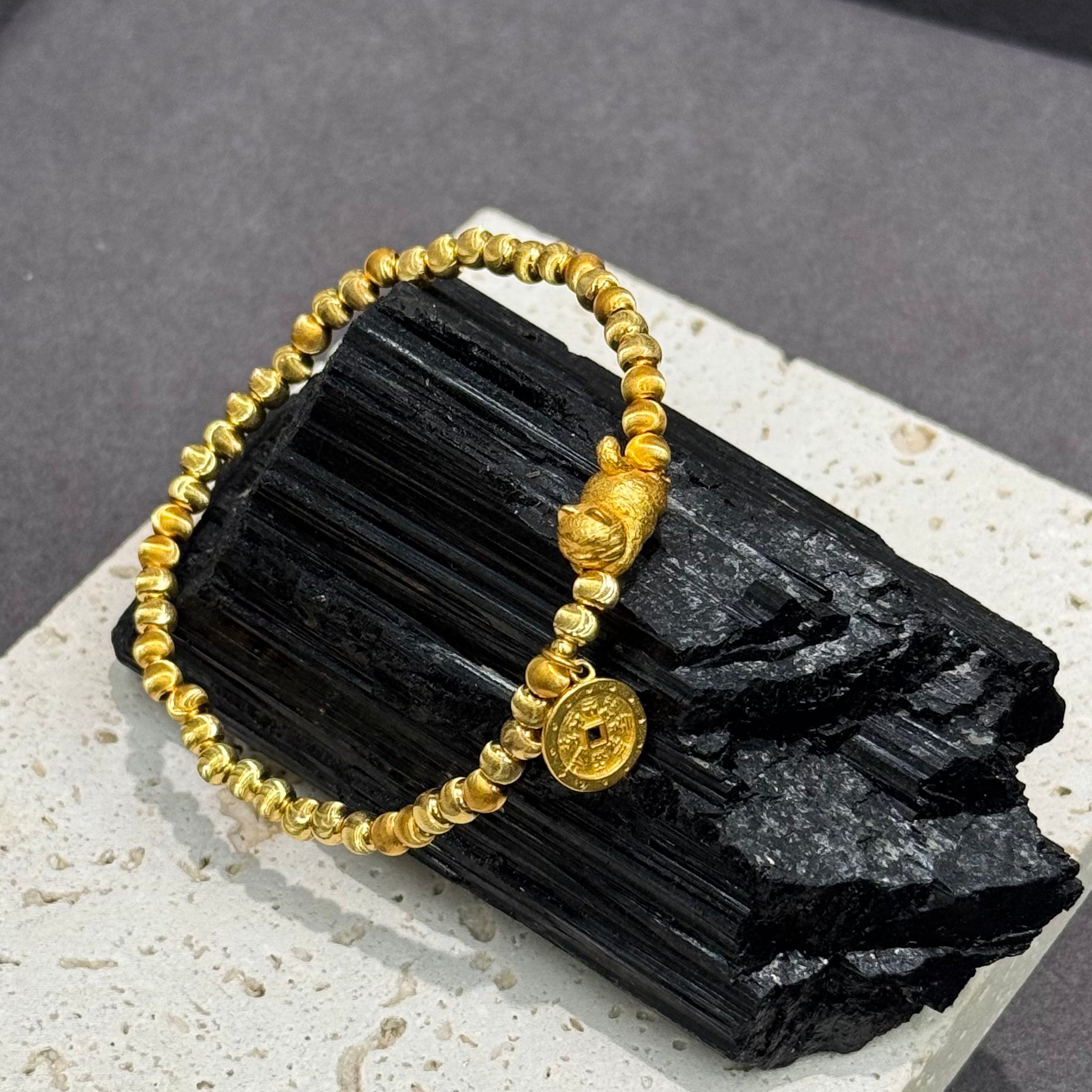 This playful bracelet brings together the charm of a lucky cat paw and the symbolism of gold coins—beckoning abundance, happiness, and auspicious energy. Crafted in gold-plated pure silver, it adds a lighthearted touch of prosperity to your everyday style.